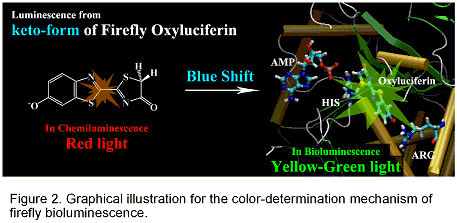 Firefly luminescence is intriguing and even mysterious photo-biological phenomenon. The firefly luciferase has also become important tool for bio-molecular imaging, because of the highly efficient conversion of chemical energy into light. In the case of North American Firefly (Photinus Pyralis), the luciferin is transformed into electronically-excited oxyluciferin (OxyLH2) inside the firefly luciferase enzyme (Luc), and exhibits the yellow-green emission. In chemiluminescence, the keto- and enol-isomers of OxyLH2 emit red (620 nm, 1.97 eV) and green (560 nm, 2.20 eV) lights, respectively (Figure 1 (a)). It has been established that this change is due to keto-enol tautomerism. Therefore, yellow-green light in the firefly luminescence had long been ascribed to the enol-form of OxyLH2. However, a recent research showed that 5,5-dimethylluciferin confined to the keto-form can exhibit the yellow-green emission. Alternative mechanisms were proposed: TICT (twisted-intramolecular charge-transfer) state mechanism (Figure 1 (b)) and resonance-structure based mechanism (Figure 1 (c).